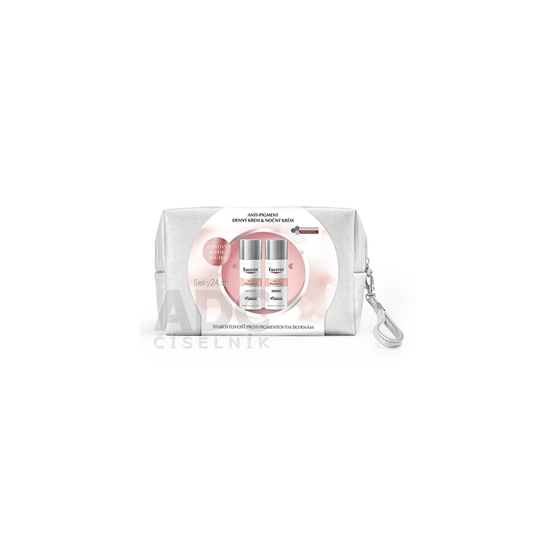 Darčeková kazeta obsahuje denný a nočný krém anti-pigment v kozmetickej taštičke.