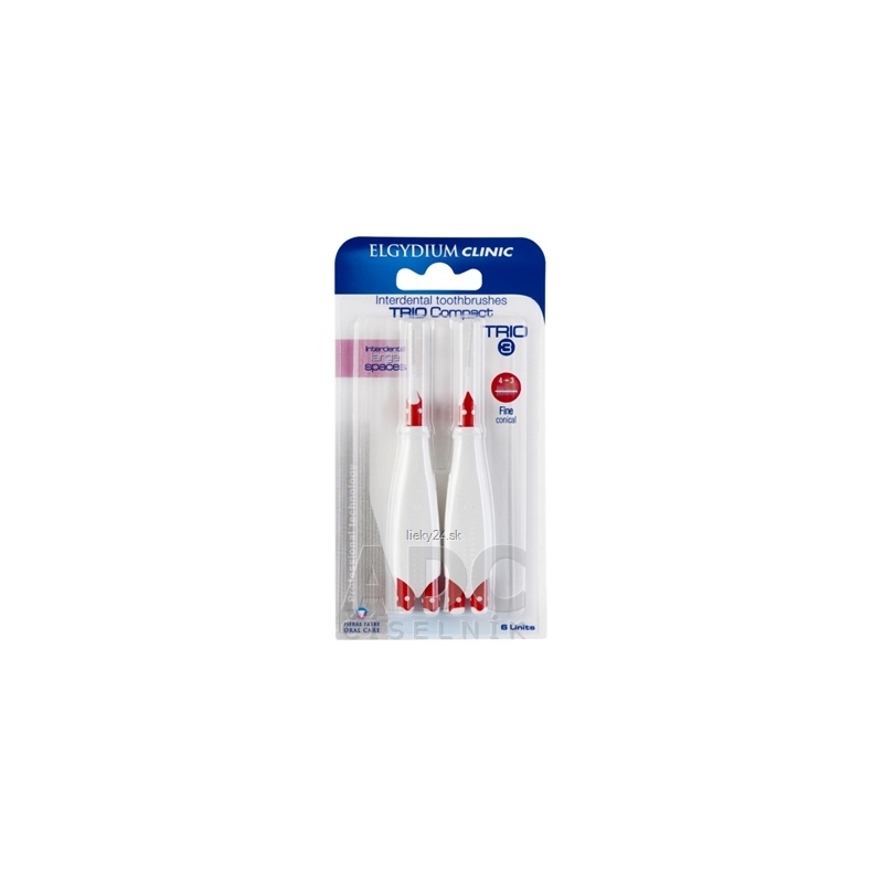 ELGYDIUM CLINIC Trio Compact medzizubné kefky 4-3mm 6ks (červená rukoväť - TRIO 3 kombinuje 3 kefky na jednom držiaku kompaktným a praktickým spôsobom. Kefky majú ultra tenké chránená vlákna, ohybný a odolný drôtik a rukoväť s protišmykovým povrchom.