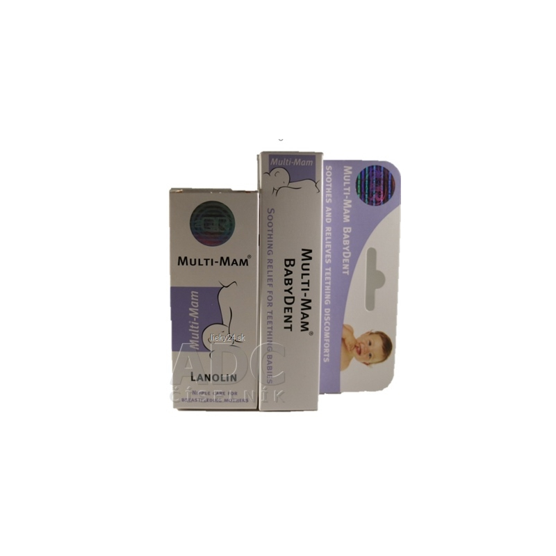 Balíček Multi-mam obsahuje Multi-Mam BabyDent - starostlivosť pri prerezávaní zúbkov a Multi-Mam Lanolin - starostlivosť o ochranu bradaviek pri dojčení.