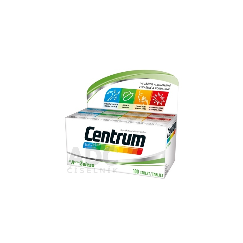 Vitamín A (RE) (retinyl-acetát + 25 % ako betakarotén) - 800 μg (100 %*), vitamín D (cholekalcifero) - 5 μg (100 %*), vitamín E (α-TE) (DL-alfa-tokoferylacetát) - 15 mg (125 %*), vitamín K (fylochinón) - 30 μg (40 %*), vitamín C ((kyselina L-askorbová) - 100 mg (125 %*), vitamín B1 (tiamínmononitrát) - 1,4 mg (127 %*), vitamín B2 (riboflavín) - 1,7 mg (125 %*), niacín (NE) (nikotínamid) - 20 mg (125 %*), vitamín B6 (pyridoxínhydrochlorid) - 2 mg (143 %*), kyselina listová (kyselina pteroylmonoglutámová) - 200 μg (100 %), vitamín B12 (kyanokobalamín) - .2.5 μg (100 %*), biotín (D-biotín) - 62,5 μg (125 %*), kyselina pantotenová (D-pantotenát vápenatý) - 7,5 mg (125 %*), vápnik (uhličitan vápenatý) - 162 mg (20 %*), fosfor (hydrogenfosforečnan vápenatý) - 125 mg (18 %*), horčík (oxid hořečnatý) - 100 mg (27 %*), železo (fumaran železnatý) - 5 mg (36 %*), zinok (oxid zinočnatý) - 5 mg (50 %*), meď (síran meďnatý) - 0,5 mg (50 %*), mangán (síran manganatý) - 2 mg (100 %*), selén (selénan sodný) - 30 μg (55 %*), chróm (chlorid chromitý) - 40 μg (100 %*), molybdén (molybdénan sodný) - 50 μg (100 %*), jód (jodid draselný) - 100 μg (67 %*).