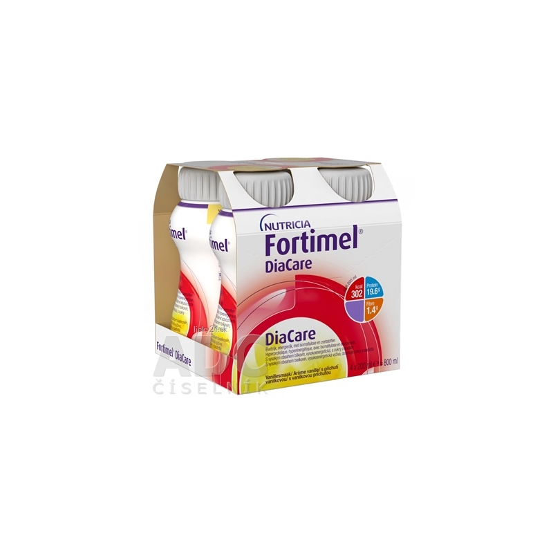 Obsahuje cukry a sladidlá. Na diétny režim pri podvýžive súvisiacej s ochorením u pacientov s diabetes mellitus alebo hyperglykémiou. Fortimel DiaCare je vysokoenergetická tekutá výživa s vysokým obsahom bielkovín. Obsahuje vlákninu. Bezgluténový. Balené v ochrannej atmosfére.