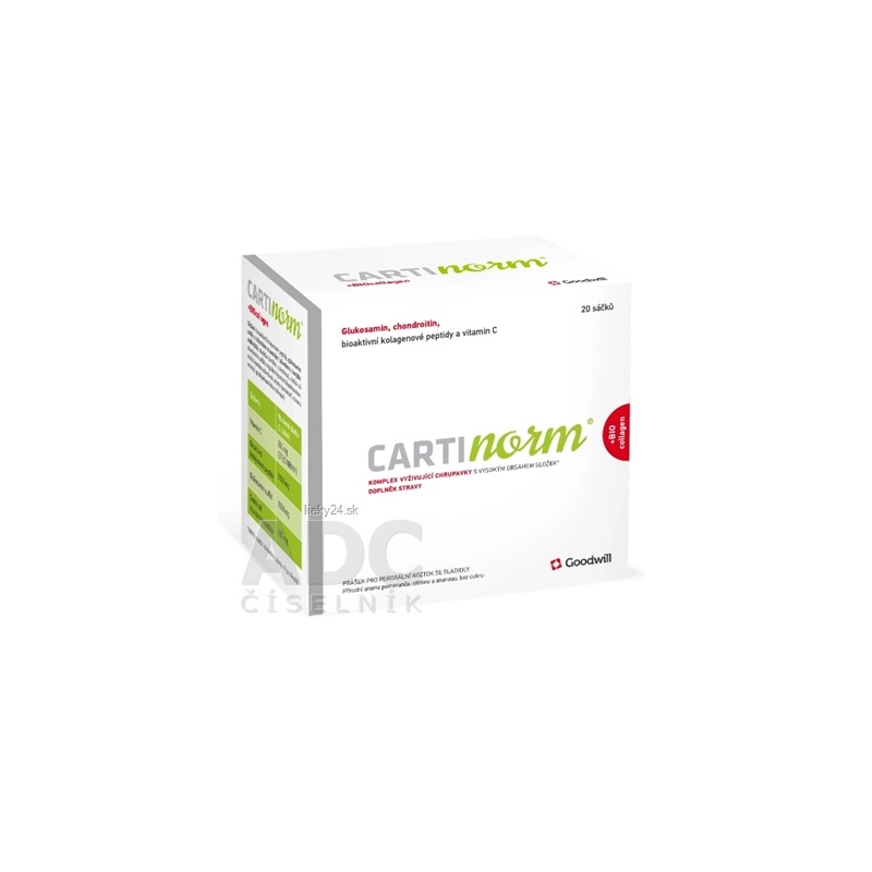 Výživový doplnok vo forme prášku na perorálny roztok obsahuje hydrolyzovaný kolagén, glukozamín, chondroitín a vitamín C.