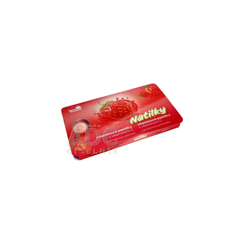 Pastilky s vitamínom C. Nečokoládová cukrovinka. S jahodovou príchuťou.