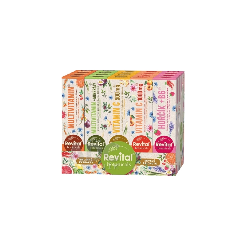 Produkty v boxe (každé po 4 balenia): VITAMÍN C 500 mg, VITAMÍN C 1000 mg, MAGNÉZIUM + B6, MULTIVITAMÍN, MULTIVITAMÍN + MINERÁLY.