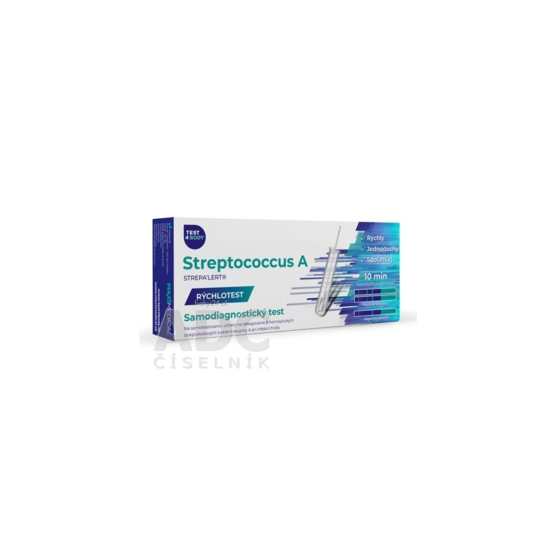 Samodiagnostická testovacia pomôcka (rýchlotest STREPA’LERT®) na na detekciu β-hemolytických streptokokových baktérií skupiny A pri infekcii hrdla.