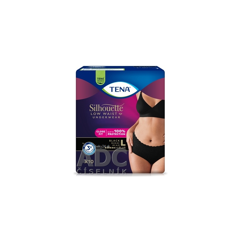 Čierne absorpčné spodné prádlo TENA Silhouette Plus pre ženy so strednou až ťažkou inkontinenciou. Hebké ako bavlna so zníženým krajkovým pásom vyzerajú úplne ako bežná spodná bielizeň.