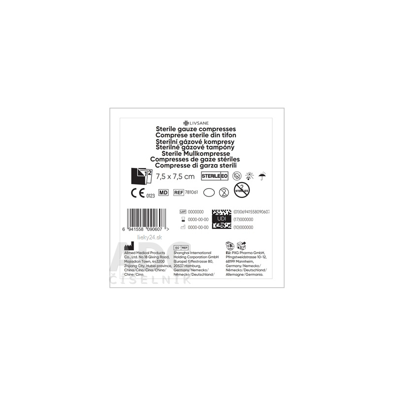 Sterilné gázové tampóny - kompresy 7,5 x 7,5 cm. Vo vrecúšku sú 2 sterilné kusy.