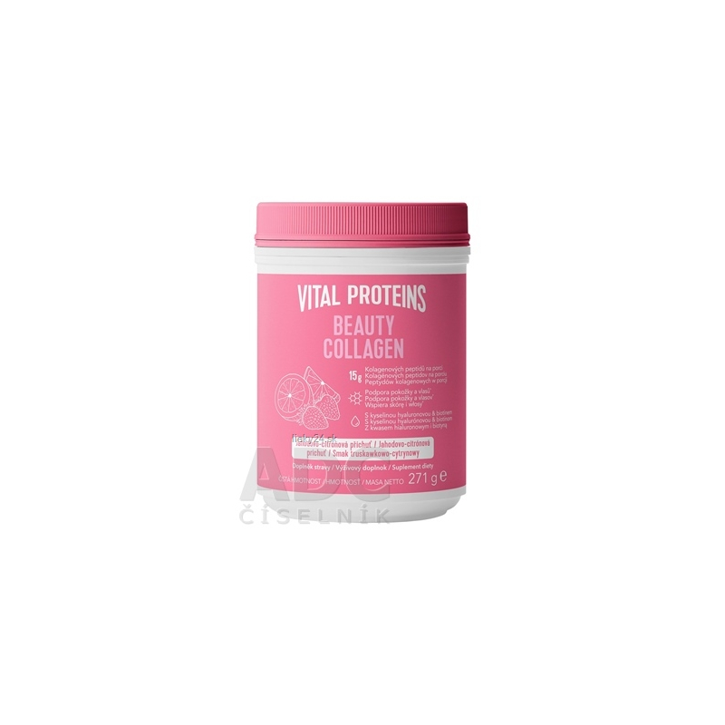 Kombinácia kolagénových peptidov, hyseliny hyalurónovej a biotínu vo forme prášku na prípravu nápoja. Jahodovo-citrónová príchuť.