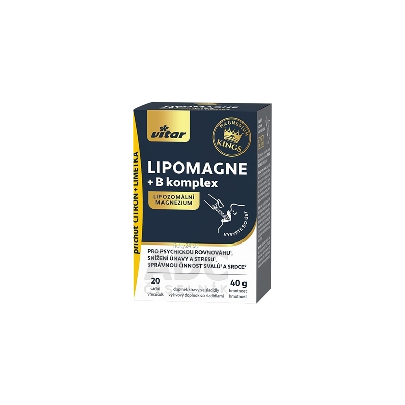 Výživový doplnok, sypká zmes s obsahom lipozomálneho magnézia a vitamínov.