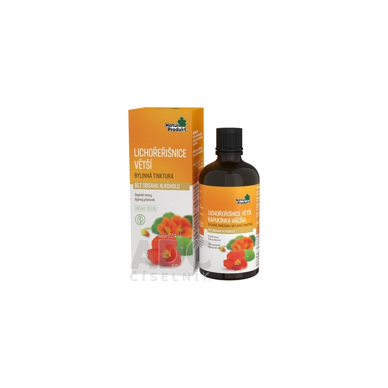 Výživový doplnok, bylinná tinktúra z rastliny Kapucínka väčšia (Tropaeolum majus).