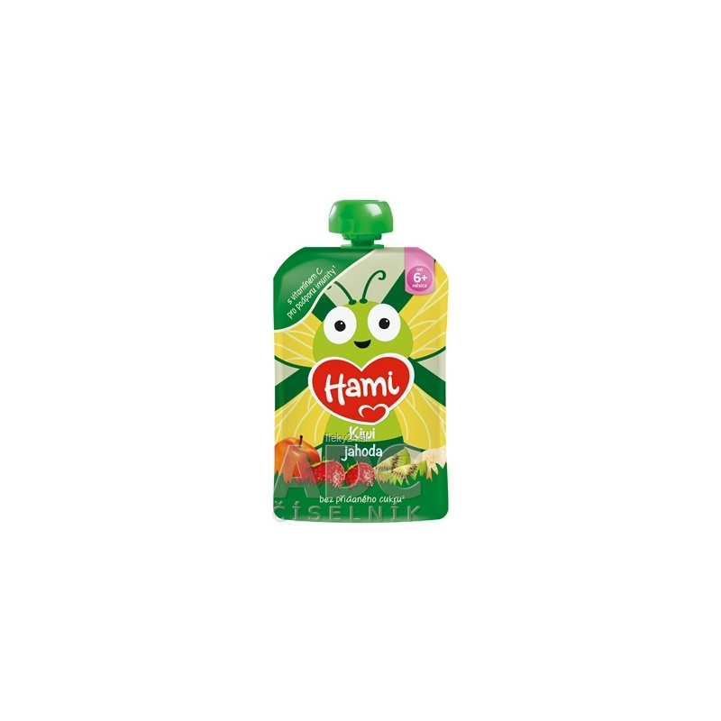 Zloženie: banán 33 %, jablko 28,5 %, jahody 20 %, kiwi 17 %, fialová mrkva, kyselina L-askorbová - zdroj vitamínu C, koncentrát citrónovej šťavy - regulátor kyslosti.