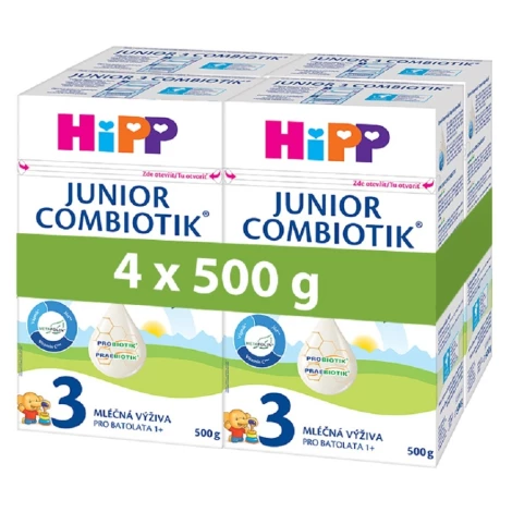 Batoľacie mlieko HiPP 3 JUNIOR Combiotic obsahuje prírodné kultúry mliečneho kvasenia, vitamíny, minerály a jód, ktorý prispieva k rozvoju kognitívnych funkcií. Batoľacie mlieko HiPP 3 JUNIOR Combiotic obsahuje nižší podiel bielkovín, je vhodná od 1.roka dieťaťa.