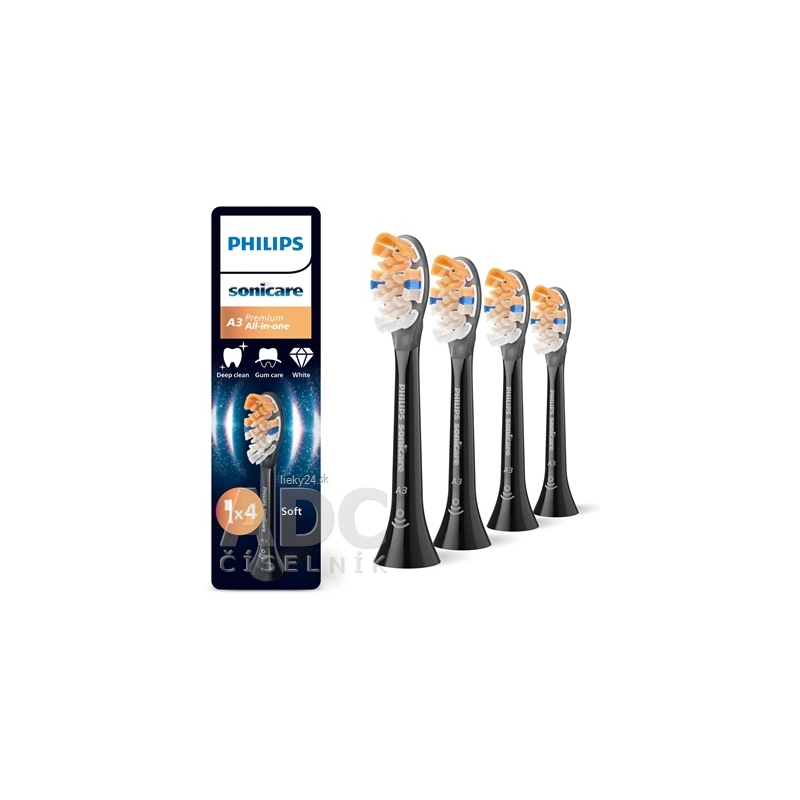 Výmenné kefkové hlavice A3 Premium All-in-One (HX9094/88). Možno ich nasadiť na telá všetkých zubných kefiek Philips Sonicare s výnimkou modelov Philips One a Essence. Na každodenné čistenie, vhodné pre odstraňovanie povlaku a nežiadúcej pigmentácie.