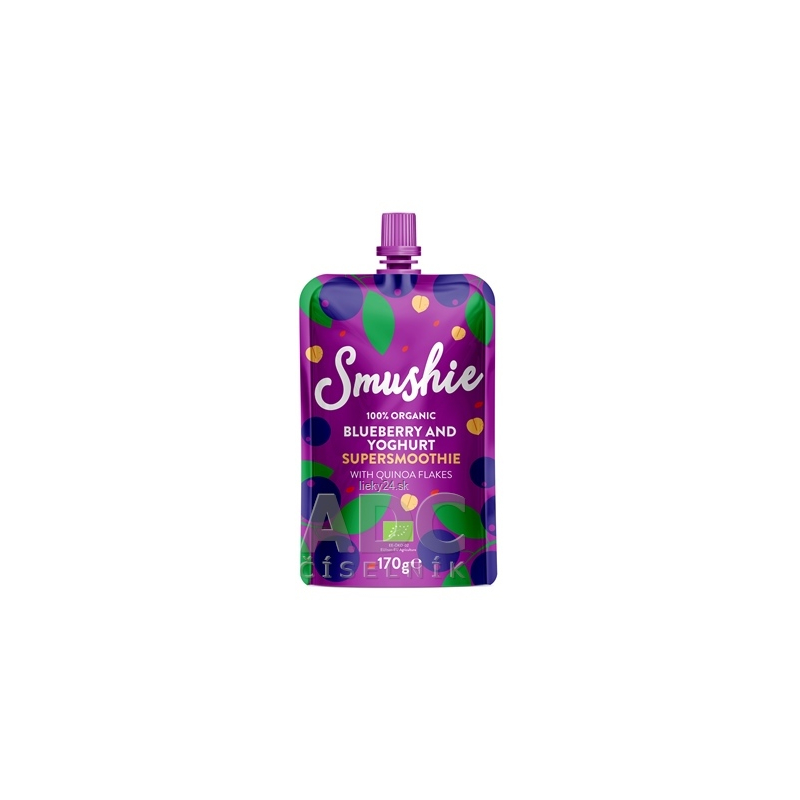 Zloženie: *banánové pyré, *jogurt 20 %, *čučoriedky 20 %, *jablkové pyré, *malinové pyré, *vločky quinoy 1 %.
