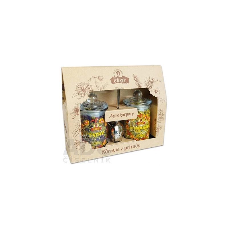 Set obsahuje 2 druhy sypaných čajov v sklenených dózach a praktické nerezové čajítko na jednoduchú prípravu.