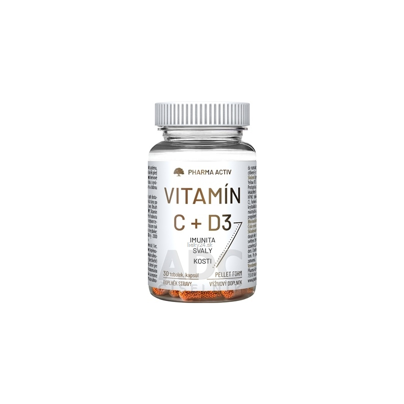 Zloženie: kyselina L-askorbová (Vitamín C), Farbivo (Sunset Yellow FCF Granular), Plnidlo (mikrokryštalická celulóza), Protihrudkujúca látka (horečnaté soli mastných kyselín), Cholekalciferol (Vitamín D3), Hydroxypropylmetylcelulóza HPMC kapsula.