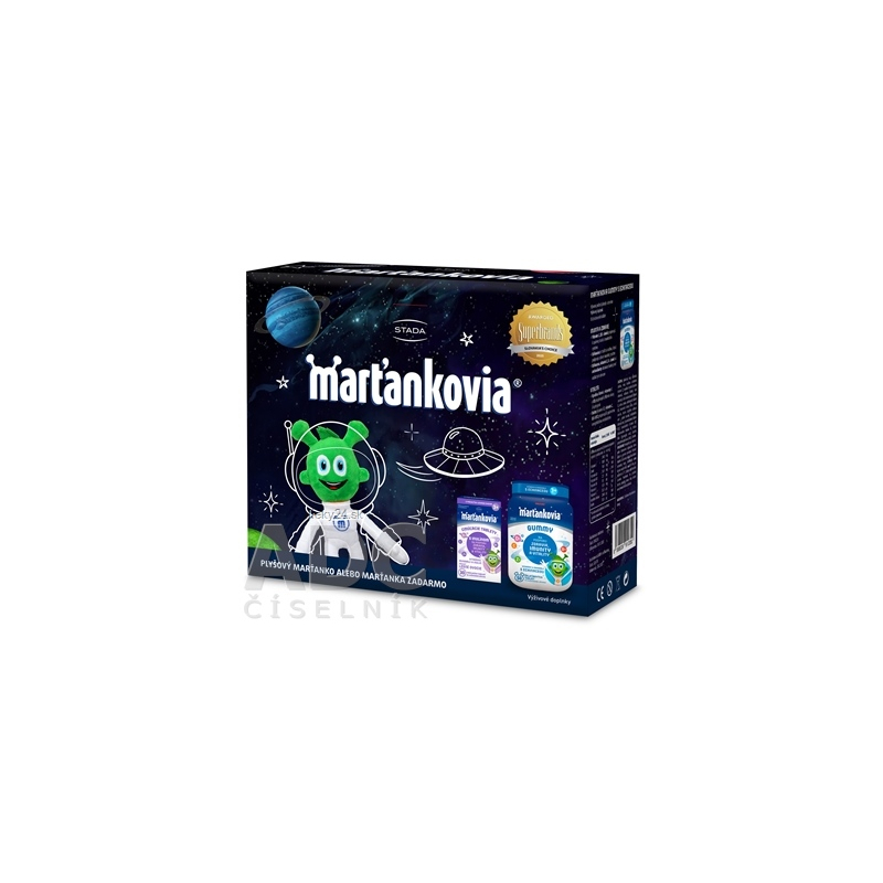 Balenie obsahuje: Marťankovia s inulínom príchuť lesné ovocie 30 cmúľacích tabliet, Marťankovia GUMMY s echinaceou 50 želatínových tabliet, plyšový Marťanko alebo Marťanka.