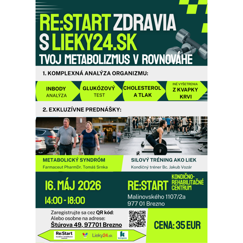 Príďte 16. mája 2026 do Brezna a nakopnite svoje zdravie pod dohľadom odborníkov na akcii RE:START zdravia s LIEKY24.sk. Čaká Vás komplexná analýza organizmu vrátane InBody merania, glukózového testu, kontroly cholesterolu a iných meraní priamo z kvapky krvi. Súčasťou programu sú exkluzívne prednášky o metabolickom syndróme a význame silového tréningu. Získate cenné rady od farmaceuta a kondičného trénera v moderných priestoroch kondično-rehabilačného centra. Čakajú na Vás darčekové balíčky so vzorkami výživových doplnkov a zliav do lekárne Lieky24.sk. Rezervujte si svoje miesto a urobte prvý krok k lepšej kondícii ešte dnes!