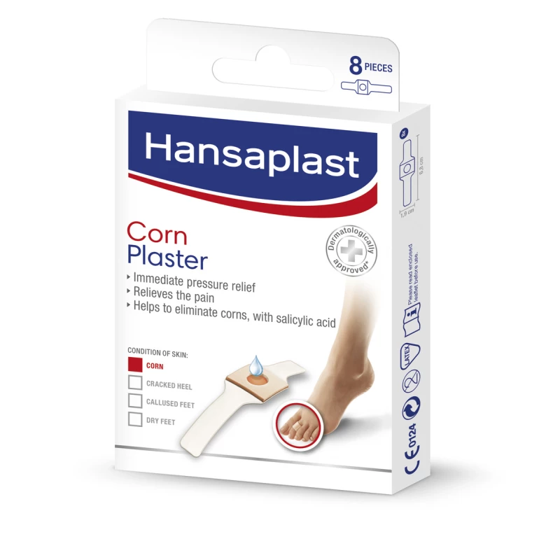 Hansaplast Náplasť na kurie oká s obsahom kyseliny salicylovej, ktorá zmäkčuje tvrdé jadro kurieho oka a pomáha odstrániť kurie oká.Hansaplast Náplasť na kurie oká zmierňuje bolesti, penový krúžok zaisťuje okamžitú úľavu od tlaku a trenia