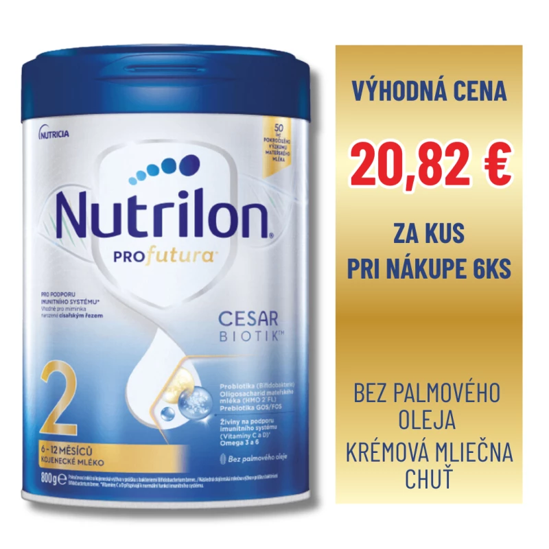 Nutrilon 2 Profutura CESARBIOTIK je následné dojčenské mlieko pre dojčatá od 6 mesiacov. Nutrilon 2 Profutura CESARBIOTIK je vhodná náhrada materského mlieka pre bábätká narodené pomocou cisárskeho rezu, ktoré nemôžu byť plne dojčené.