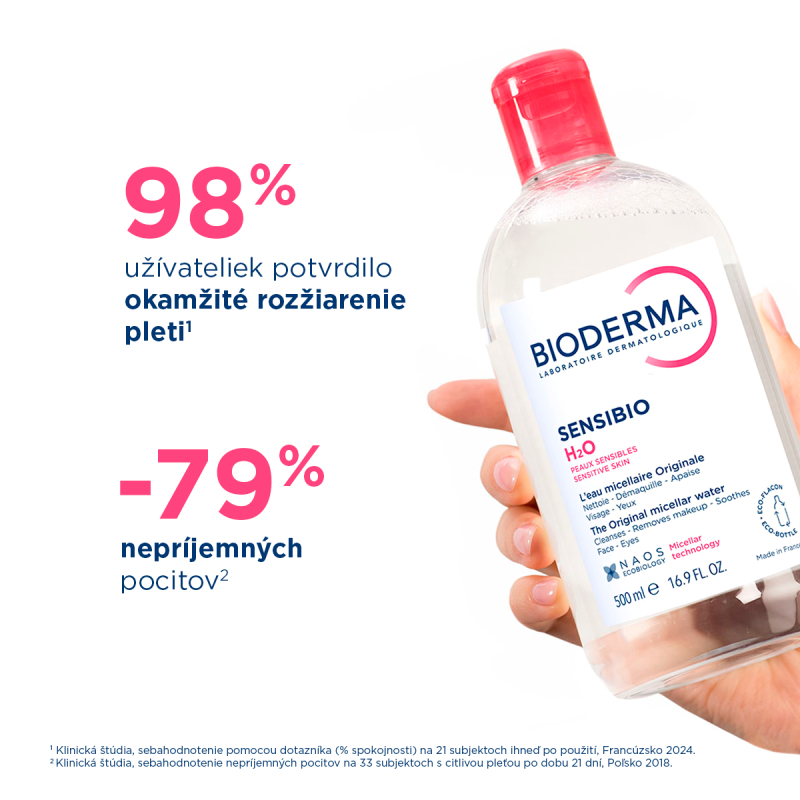 Charakteristika: Sensibio H2O je prvou a jedinou dermatologickou micelárnou vodou dokonale kompatibilnou s pokožkou: jej estery mastných kyselín, micely, sú podobné fosfolipidom bunkových membrán kože a prirodzene pomáhajú pri obnove hydrolipidického filmu pokožky.