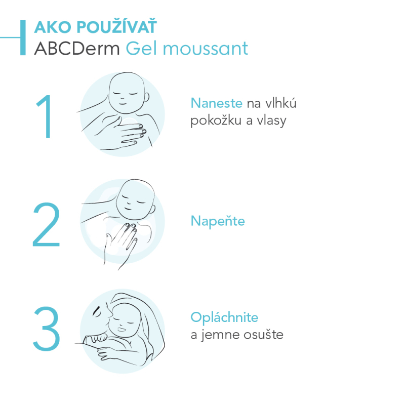- Naneste ABCDerm Moussant jemný čistiaci gél na vlhkú pokožku a/alebo vlasy.
