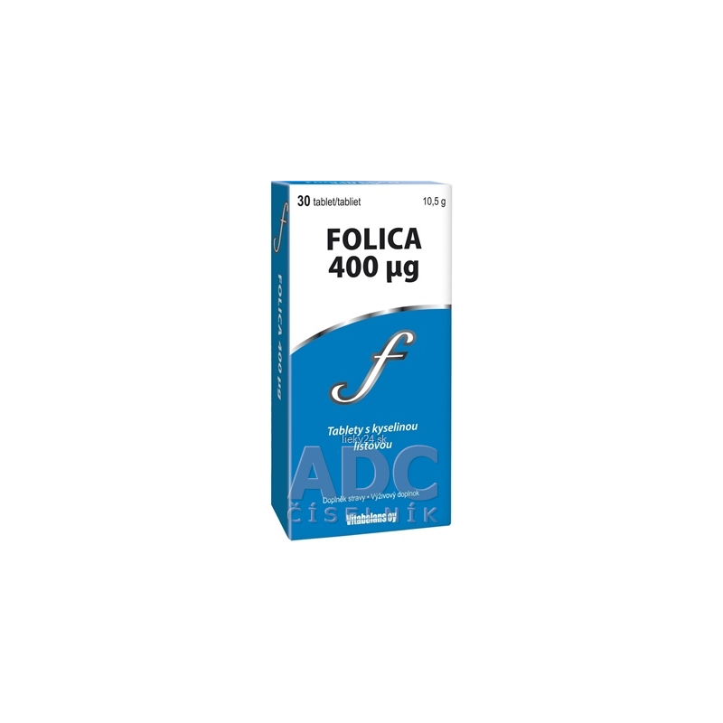 Tablety s obsahom kyseliny listovej. 1 tableta obsahuje 400 μg kyseliny listovej.