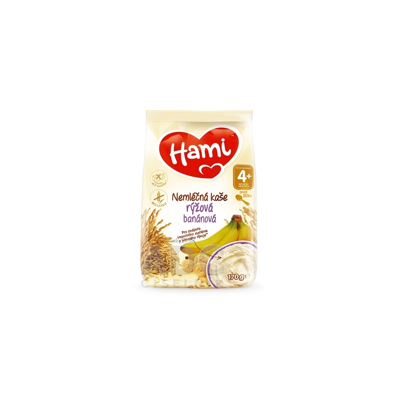 Nemliečna obilná kaša ryžová banánová. Potravina na báze obilia určená pre dojčatá a malé deti od ukončeného 4. mesiaca vždy podľa odporúčania pediatra, v prášku. Obsahuje obilniny (ryža), ktoré sú prirodzeným zdrojom energie pre každý deň a naviac podporuje imunitný systém a zdravý vývoj dieťatka. Neobsahuje kravské mlieko, preto je vhodná aj v prípade alergie na bielkovinu kravského mlieka. Hami nemliečna kaša krupicová bez pridaného cukru (obsahuje prírodné cukry) je vhodná na večeru alebo raňajky. Pre čo najprirodzenejší prechod z tekutej stravy možno kašičku pripraviť s materským mliekom, dojčenským mliekom alebo so špeciálnym dojčenským mliekom (mlieko s čiastočne alebo úplne hydrolyzovanými bielkovinami).