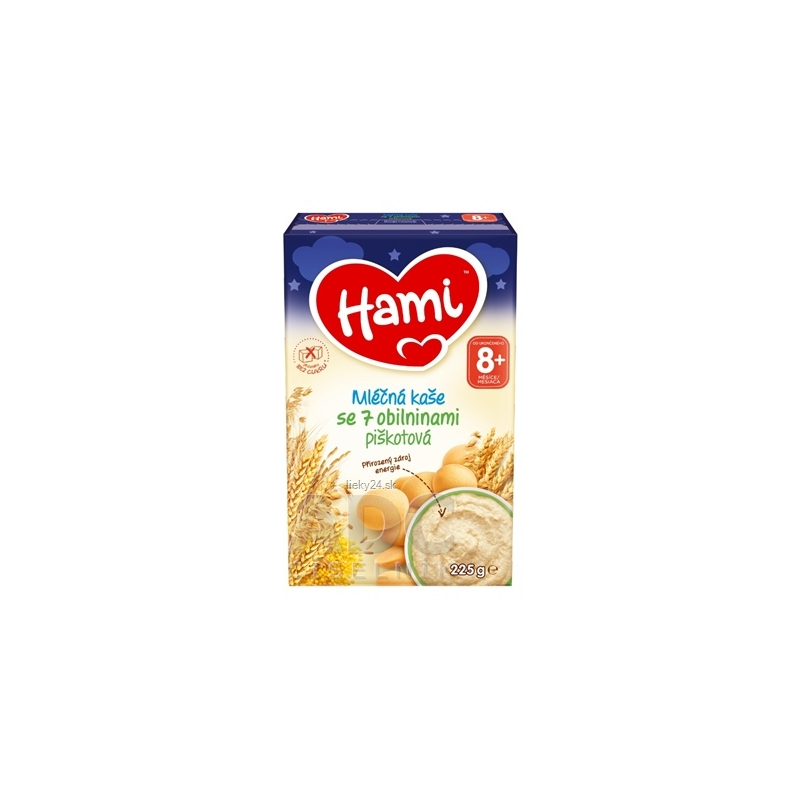 Potravina na báze obilia určená pre dojčatá a malé deti od ukončeného 8. mesiaca, v prášku. Jedna porcia kaše denne tak pomáha postupne zavádzať nové chute obilnín či ovocia a vytvárať zdravé stravovacie návyky. Hami mliečna kaša so 7 obilninami piškótová bez pridaného cukru (obsahuje prírodné cukry) je vhodná na večeru alebo raňajky.