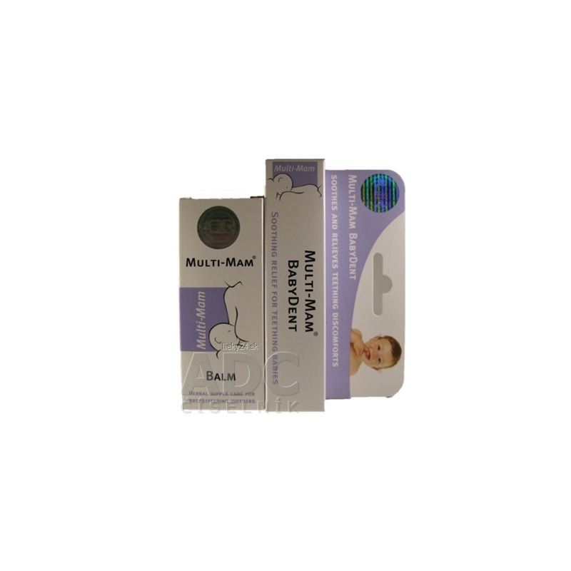 Balíček Multi-mam obsahuje Multi-Mam BabyDent - starostlivosť pri prerezávaní zúbkov a Multi-Mam Balm - starostlivosť o ochranu bradaviek pri dojčení.