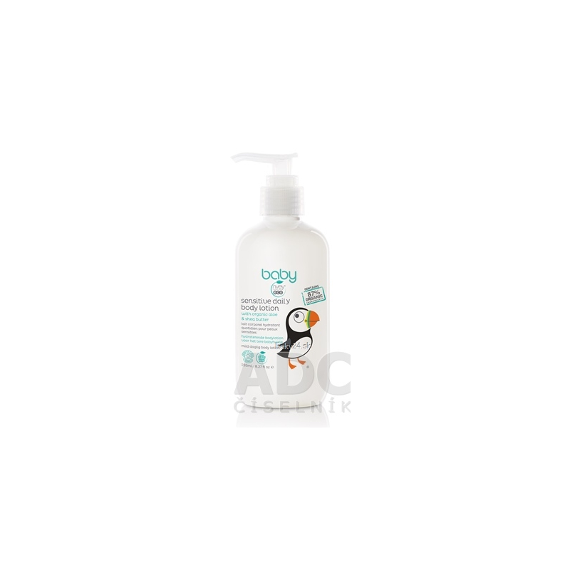 Telové mlieko (lotion) s obsahom 87% BIO zložiek, určené pre citlivú detskú pokožku. Obsahuje aloe vera, bambucké maslo, kokosový olej, s vôňou levandule. Jemne hydratuje a chráni citlivú detskú pokožku.