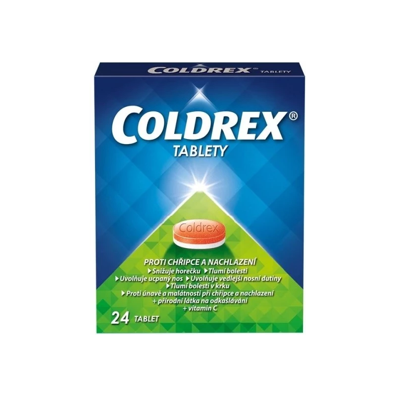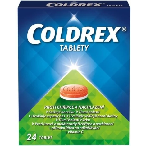 Indikácie: COLDREX tablety obsahujú paracetamol, liečivo proti bolesti a horúčke, ktoré odstraňuje bolesti v hrdle, bolesti hlavy, svalov aj kĺbov a znižuje horúčku. Ďalej fenylefrín, ktorý uvoľňuje upchatý nos aj prinosové dutiny a tak uľahčuje dýchanie. COLDREX tablety tiež obsahuje vitamín C, ktorý pri chrípke a prechladnutí telu často chýba. COLDREX tablety neobsahujú kyselinu acetylsalicylovú.
