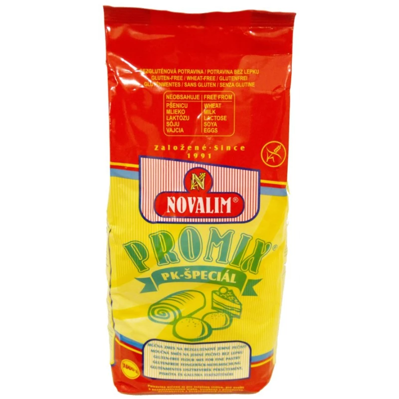 PROMIX-PK špeciál zmes na bezlepkové jemné pečivo dietetická potravina na prípravu jemného pečiva, halušiek, knedlí a bežné kulinárske použitie v domácnosti. PROMIX-PK špeciál zmes na bezlepkové jemné pečivo neobsahuje mlieko, laktózu a sóju.