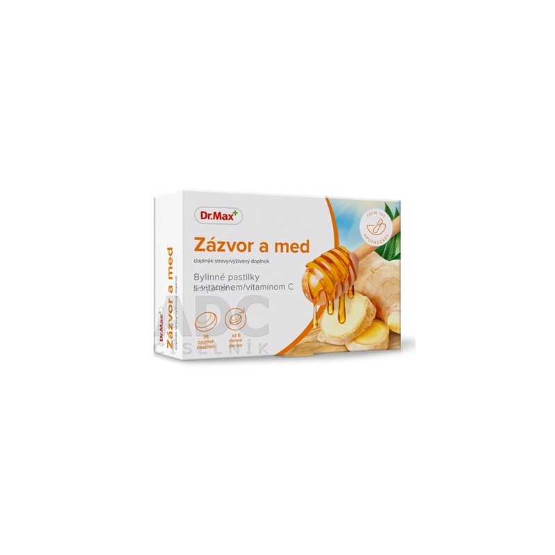 Výživový doplnok, bylinné pastilky obsahujú včelí med a extrakt zo zázvoru (Zingiber officinale).