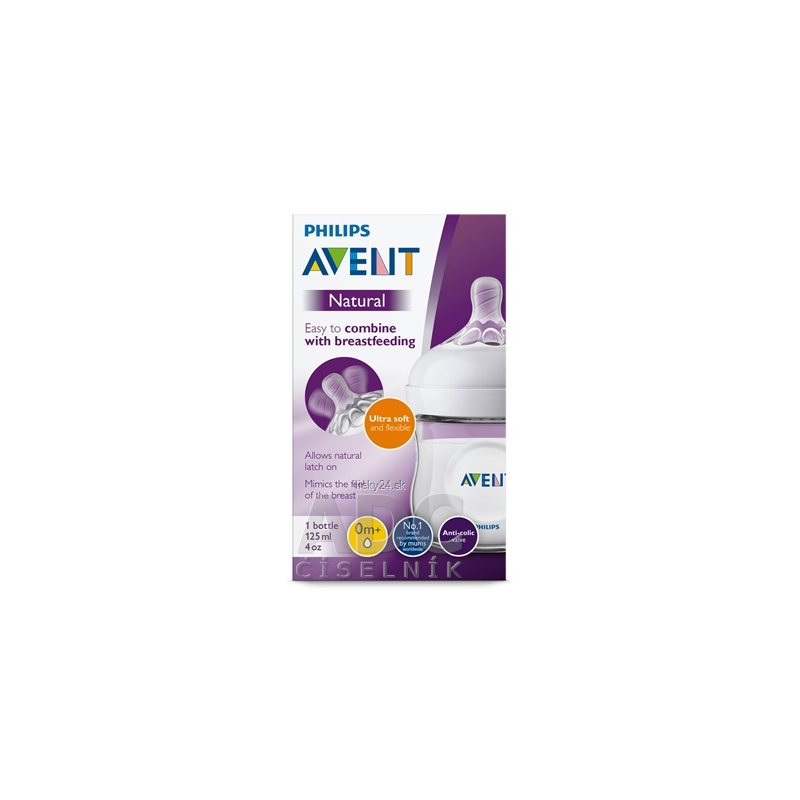 Dojčenská fľaša s extra mäkkým novorodeneckým cumlíkom AVENT Natural. Fľaša je vyrobená z polypropylénu(PP), ktorý je polopriehľadný a mliečnej farby. Neobsahuje BPA (Bisfenol A). Cumlík je široký, má lupienkový dizajn a umožňuje prirodzenejšie kŕmenie dieťatka.