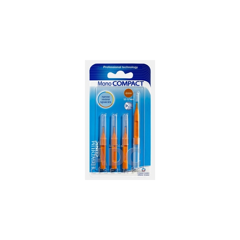 Medzizubné kefky ELGYDIUM CLINIC MONO COMPACT úzke 3,5-2,7mm (oranžová rukoväť) sú vďaka tenkým drôtikom a kvalitným vláknam Tynex ® vhodné na čistenie ťažko prístupných miest.