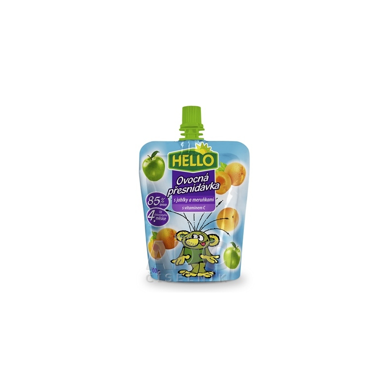 Ovocná výživa s jablkami, marhuľami a vitamínom C. Obal s detským rozprávkovým motívom - Rákosníčka.