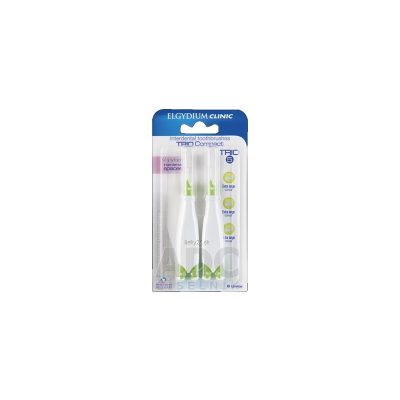 ELGYDIUM CLINIC Trio Compact medzizubné kefky 8-7 mm 6ks (zelená rukoväť - TRIO 5 kombinuje 3 kefky na jednom držiaku kompaktným a praktickým spôsobom. Kefky majú ultra tenké chránená vlákna, ohybný a odolný drôtik a rukoväť s protišmykovým povrchom.