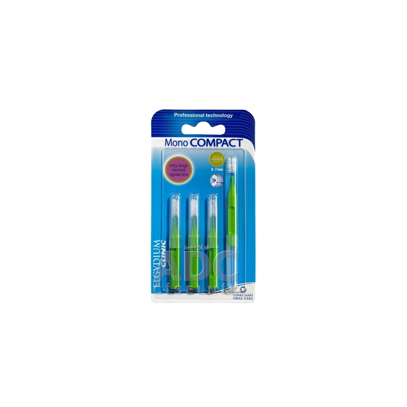 Medzizubné kefky ELGYDIUM CLINIC MONO COMPACT extra široké 8-7 mm (zelená rukoväť) sú vďaka tenkým drôtikom a kvalitným vláknam Tynex ® vhodné na čistenie ťažko prístupných miest.