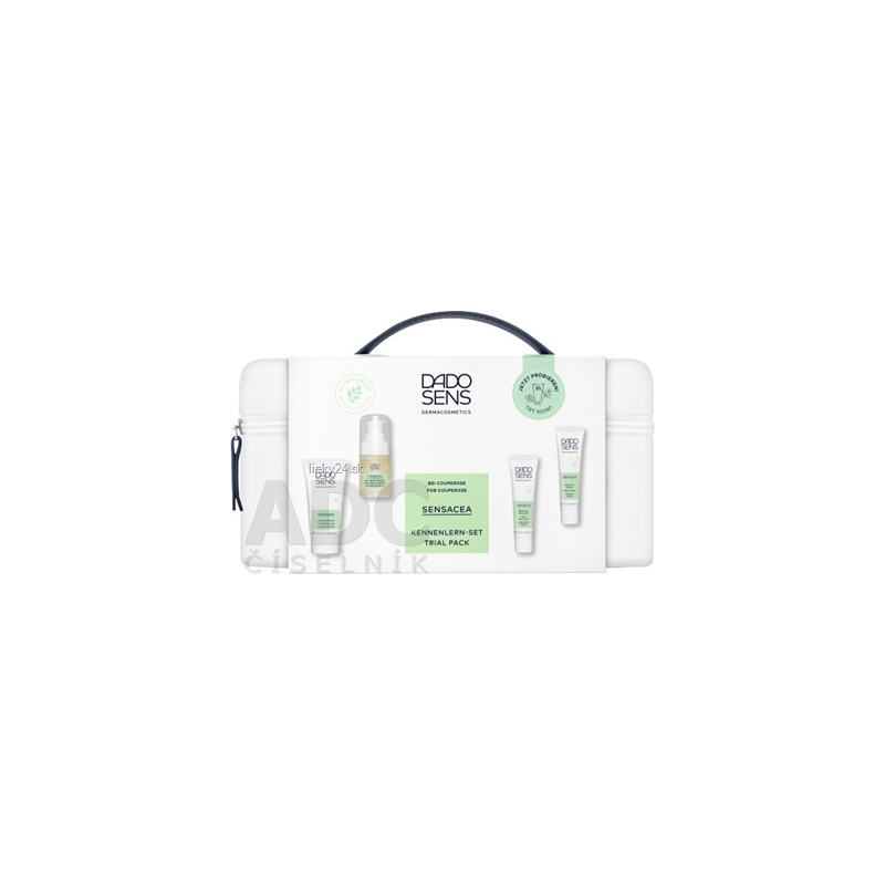 Set kozmetických prípravkov DADO SENS SENSACEA určených pre veľmi citlivú pokožku a pleť so sklonom k začervenaniu, v kozmetickej taštičke.