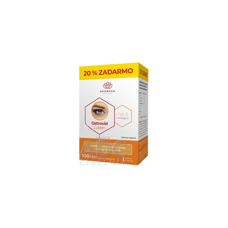 Výživový doplnok. Kombinácia extra dávky luteínu + betakarotén, zeaxantín, vitamín E, omega-3 (EPA + DHA) + extrakt z čučoriedok a očianky rostkovovej.