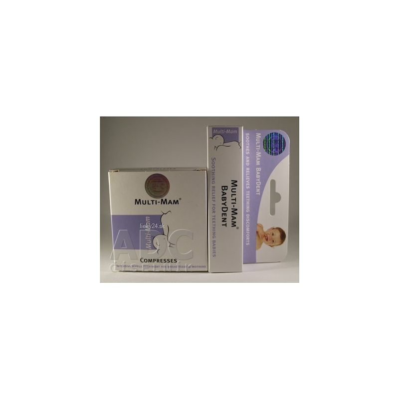 Balíček Multi-mam obsahuje Multi-Mam Compresses - starostlivosť o bolestivé bradavky a Multi-Mam BabyDent - starostlivosť pri prerezávaní zúbkov.