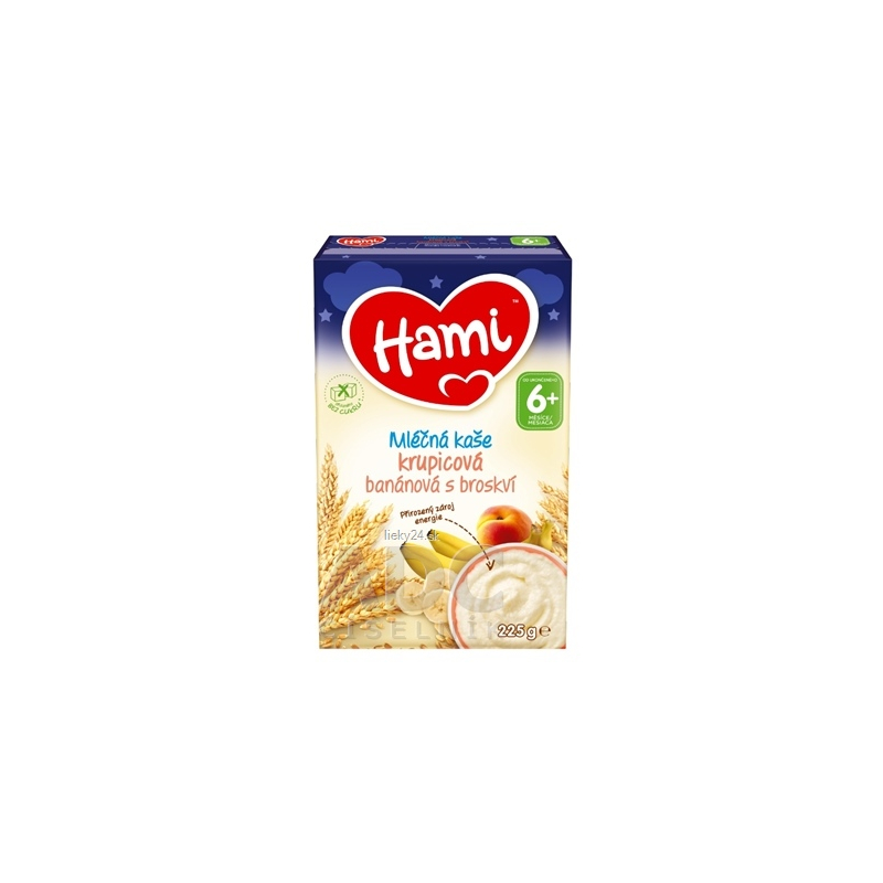 Potravina na báze obilia určená pre dojčatá a malé deti od ukončeného 6. mesiaca, v prášku. Jedna porcia kaše denne tak pomáha postupne zavádzať nové chute obilnín či ovocia a vytvárať zdravé stravovacie návyky. Hami mliečna kaša krupicová banánová s broskyňou bez pridaného cukru (obsahuje prírodné cukry) je vhodná na večeru alebo raňajky.
